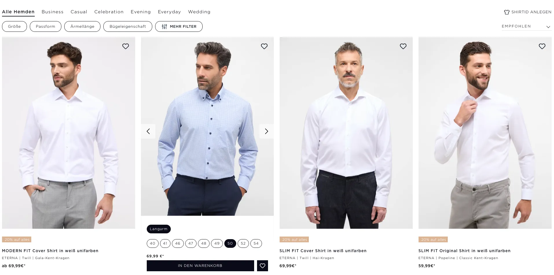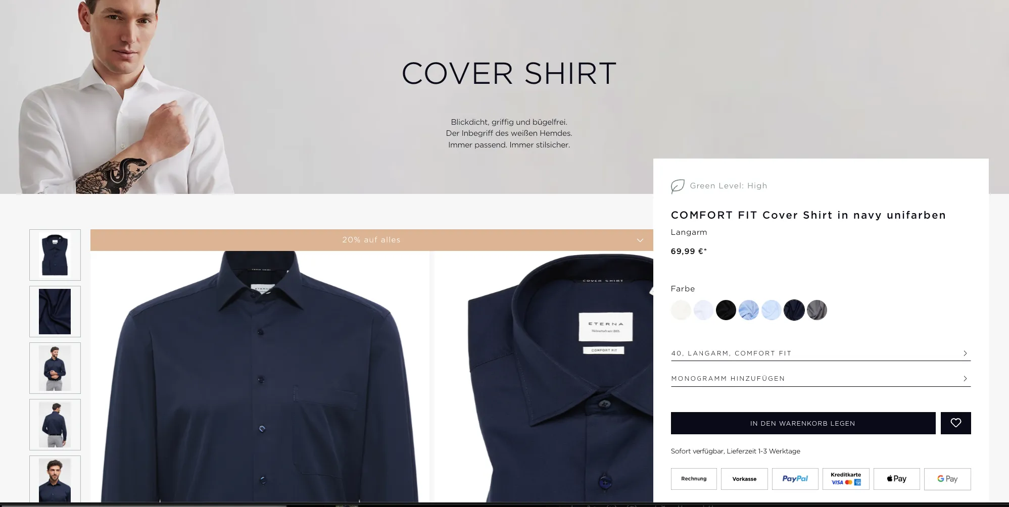 Project description: Founded in 1863 as a lingerie factory, the long-established ETERNA company stands for timelessly modern elegance, the highest quality, and numerous innovations in modern men’s shirts and women’s blouses. With its patented invention of shirt collars made of special fabric, the company was the world’s first clothing company to be certified according to the Oeko-Tex Standard 100 plus and remains the market leader in crease- and iron-free shirts and blouses. As a specialist, ETERNA can fully utilize its in-depth knowledge of its core product range – perfect fit, variation in sleeve lengths and variations, and collar shapes are just a few examples. With high-quality cotton fabrics and the latest clothing innovations, ETERNA asserts itself as a master of business fashion.