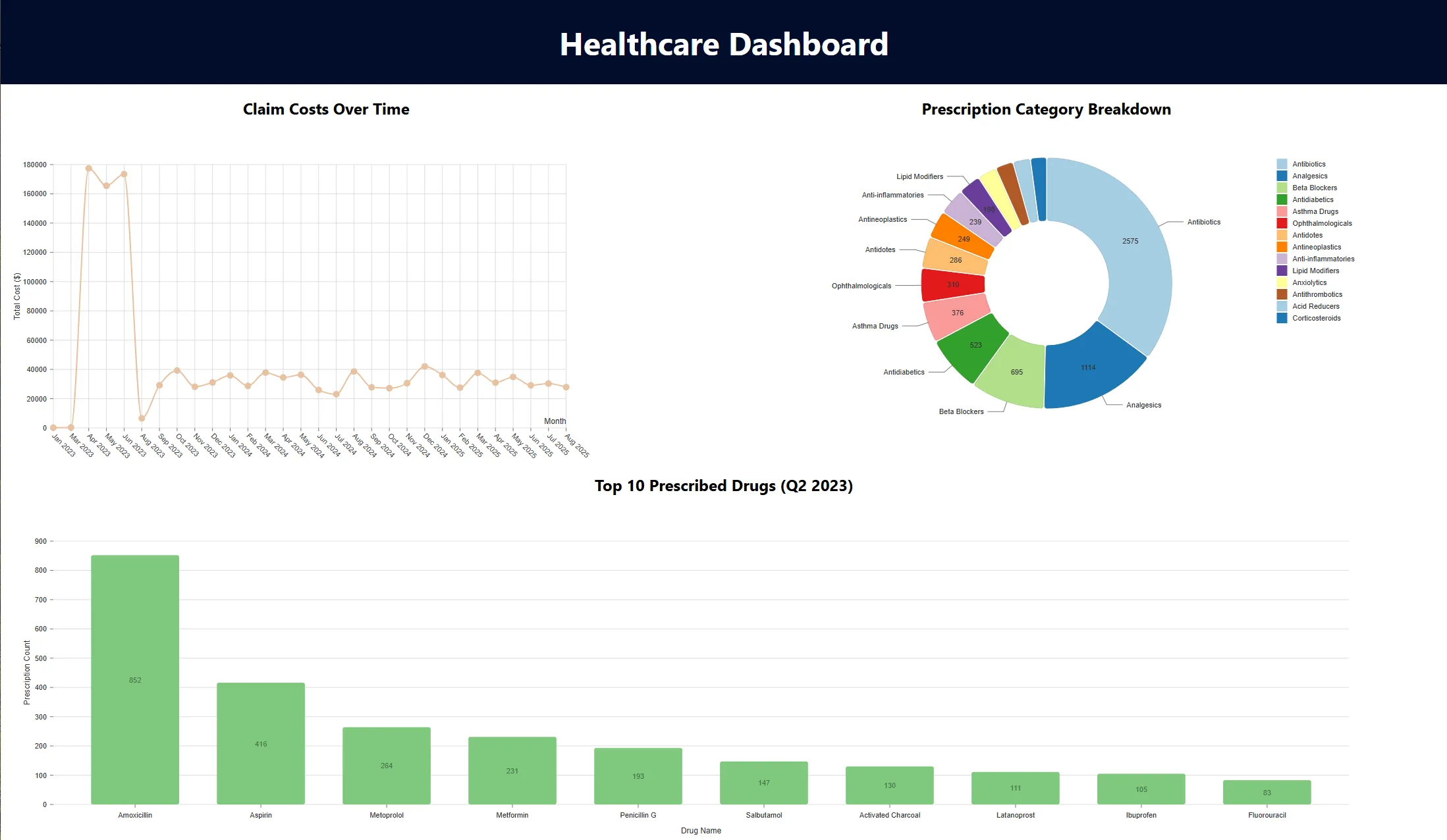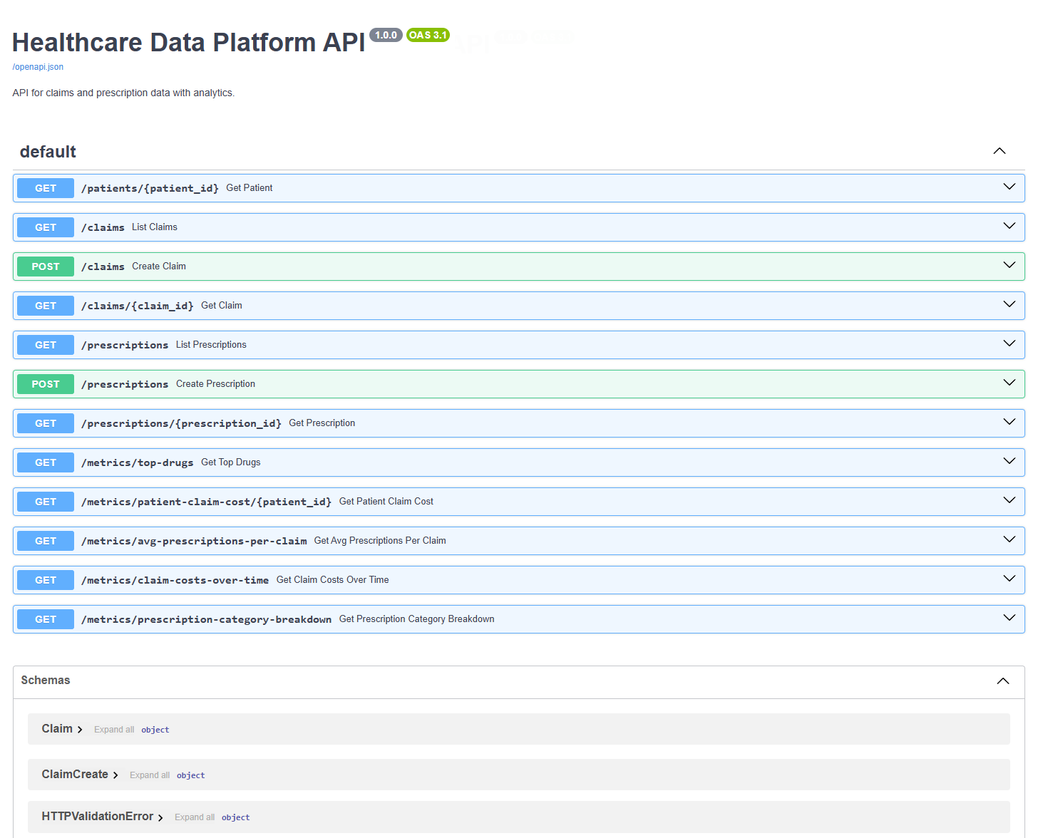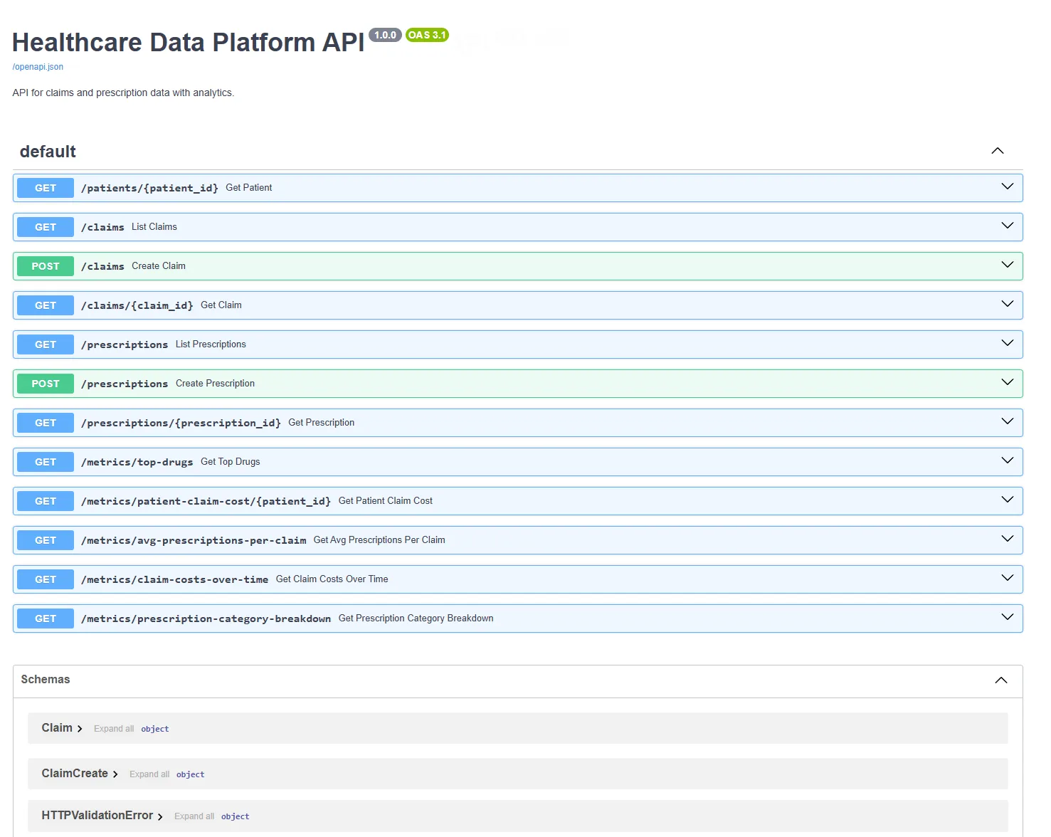 Project description: This project was a solution for the technical case for the Senior Software Engineer position. It is a basic healthcare data platform focused on claims and prescription data, with a relational database, RESTful APIs, and a minimal analytics dashboard.