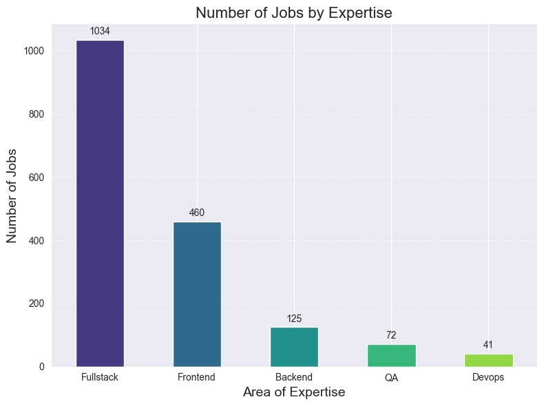 plt.title('Number of Jobs by Expertise', fontsize=16)