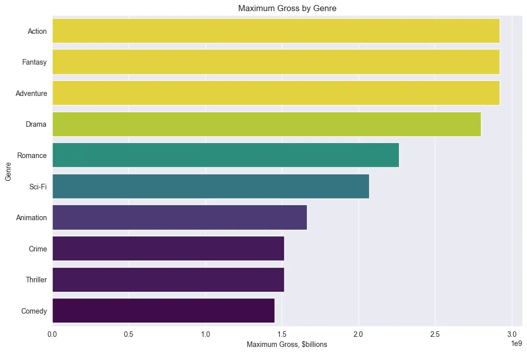 sns.barplot(x=max_gross, y=genre_names, hue=max_gross, palette="viridis", legend=False, orient='h')