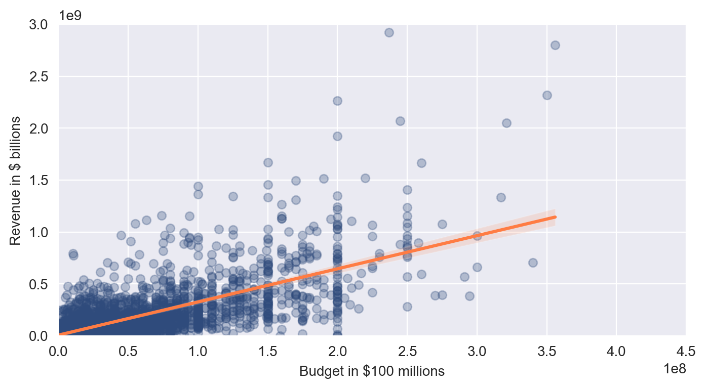 We also see that a film with a $150 million budget is predicted to make slightly under $500 million by our regression line. All in all, we can be pretty confident that there does indeed seem to be a relationship between a film’s budget and that film’s worldwide revenue.